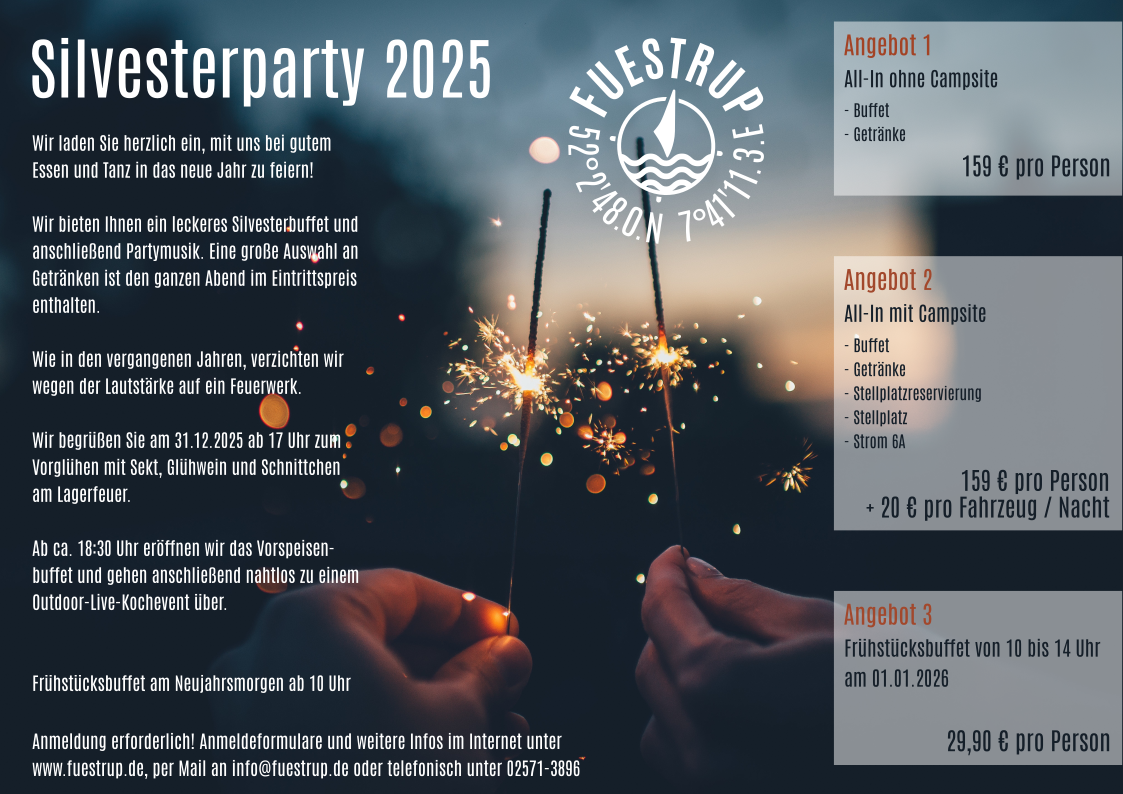 -> Bitte beachten Sie, dass wir dieses Jahr Bereiche auf dem Wohnmobilstellplatz eigens für Vorreservierungen für die Silvester Party absperren. Stellplatznummern werden nicht vergeben, aber sie dürfen dann bei Ihrer Ankunft aus den freien Plätzen wählen.