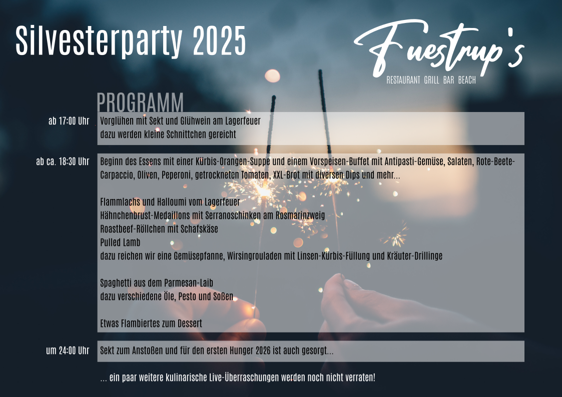 Wir bieten Ihnen ein leckeres Silvesterbuffet mit Outdoor-Live-Kochevent und anschließend Partymusik, verzichten jedoch wegen der Lautstärke, wie in den vergangenen Jahren, auf ein Feuerwerk und auf einen DJ.